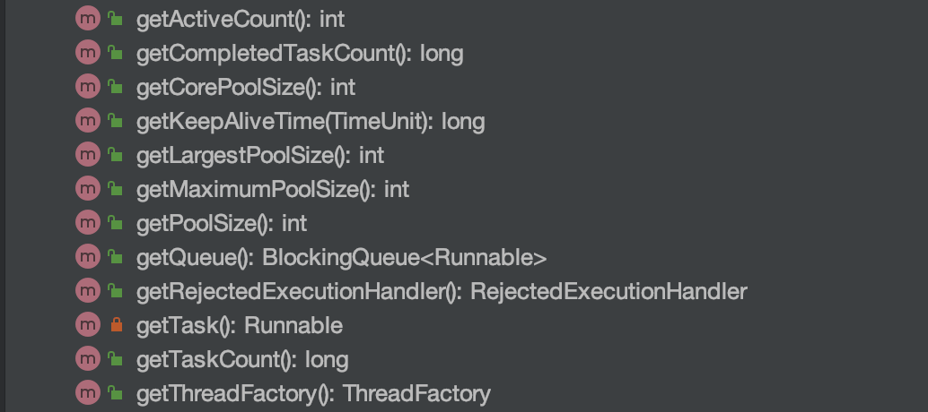 除此之外,我们还可以利用 ThreadPoolExecutor 的相关 API做一个简陋的监控。从下图可以看出, ThreadPoolExecutor提供了获取线程池当前的线程数和活跃线程数、已经执行完成的任务数、正在排队中的任务数等等。